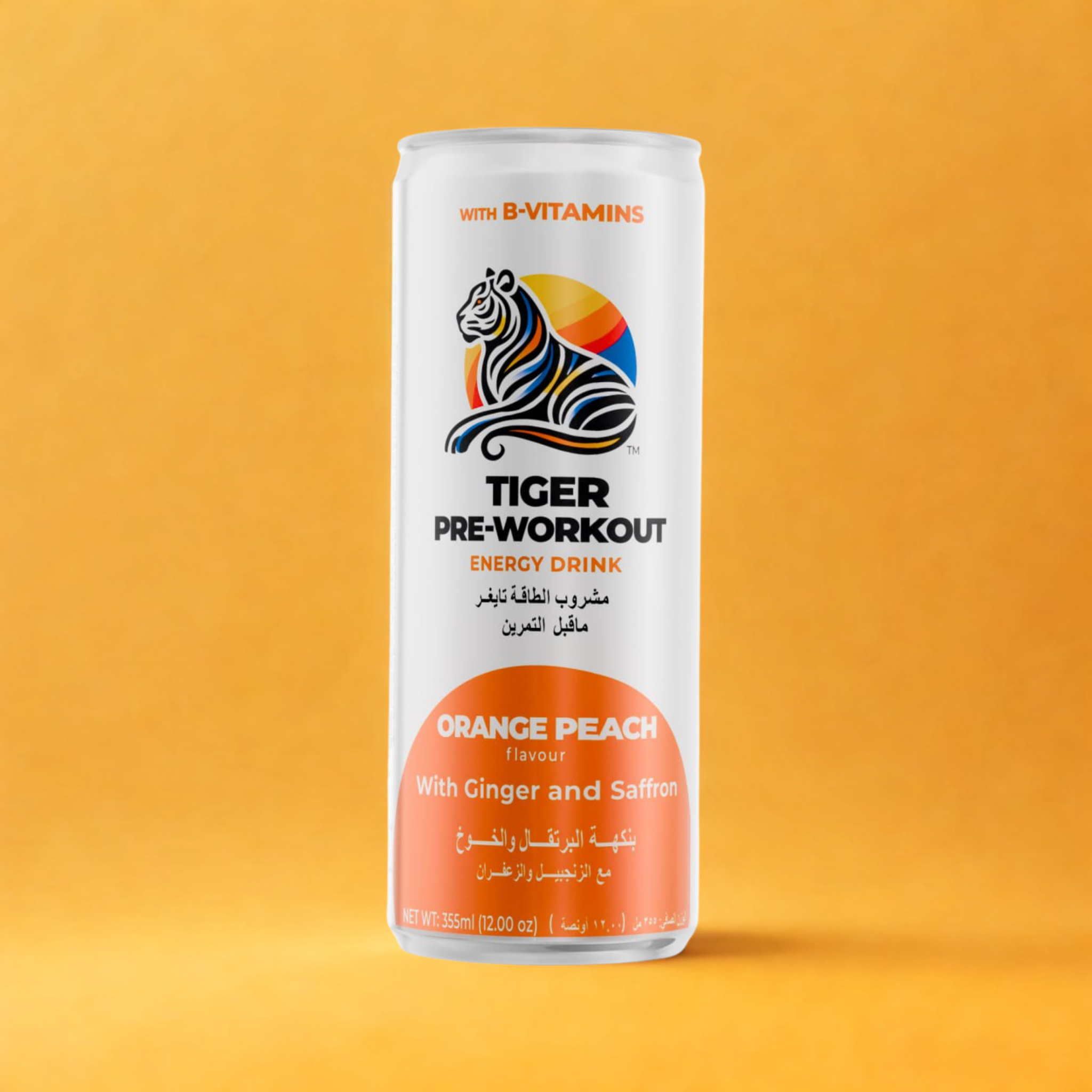 Fuel your body and mind with Tiger Pre-Workout Energy Drink, a premium blend crafted to deliver clean and lasting energy. Each can combines saffron, ginger, green tea extract, vitamins B3, B6, B12, pink Himalayan salt, sea salt, and natural orange peach flavor — creating a refreshing taste with powerful performance benefits.